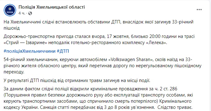 "Дорожно-транспортное происшествие произошло вчера, 17 октября, около 20:00 часов на трассе "Стрый — Изварино" недалеко от гостинично-ресторанного комплекса "Аист". 54-летний хмельничанин, управляя автомобилем Volkswagen Sharan, совершил наезд на 33-летнего жителя областного центра, который пересекал дорогу по нерегулируемому пешеходному переходу. В результате ДТП пешеход от полученных травм погиб на месте происшествия", - сказано в сообщении полиции.