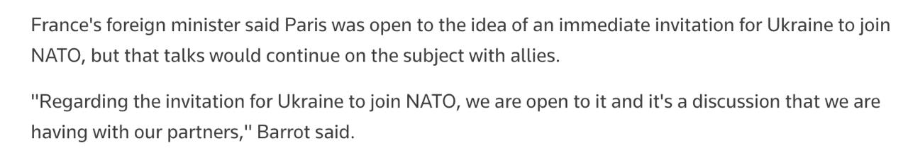 Также Барро добавил, что Франция "открыта для идеи" приглашения Украины в НАТО, но будет продолжать переговоры с союзниками по этому вопросу.