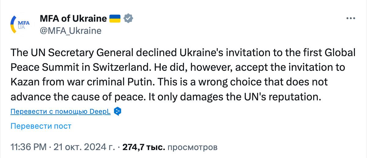 "Генеральный секретарь ООН отклонил приглашение Украины на первый Глобальный саммит мира в Швейцарии. Однако он принял приглашение в Казань от военного преступника Путина. Это неправильный выбор, который не способствует делу мира. Он только вредит репутации ООН", - говорится в сообщении министерства в Х.