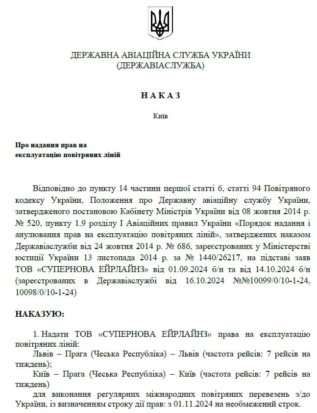 В приказе сказано, что логистическая компания получила право на эксплуатацию воздушных линий Львов-Прага-Львов и Киев-Прага-Киев.