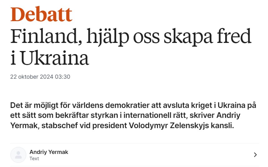 Об этом написал глава Офиса президента Андрей Ермак в колонке для финской Hufvudstadsbladet.