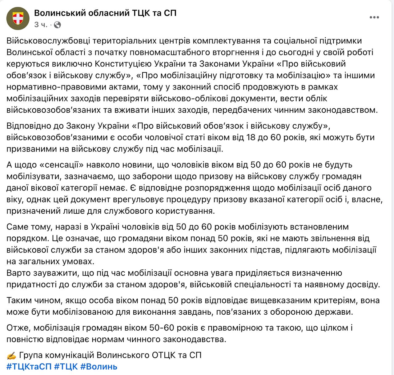 "Согласно закону Украины "О воинской обязанности и военной службе", военнообязанными являются лица мужского пола в возрасте от 18 до 60 лет, которые могут быть призваны на военную службу во время мобилизации. А по поводу "сенсации" вокруг новости, что мужчин в возрасте от 50 до 60 лет не будут мобилизовать, отмечаем, что запрета на призыв на военную службу граждан данной возрастной категории нет. Есть соответствующее распоряжение о мобилизации лиц такого возраста, однако этот документ регулирует процедуру призыва указанной категории лиц и, собственно, предназначен только для служебного пользования. Именно поэтому в Украине мужчин от 50 до 60 лет мобилизуют установленным порядком. Это означает, что граждане старше 50 лет, не имеющие освобождения от военной службы по состоянию здоровья или других законных оснований, подлежат мобилизации на общих условиях", - сказано в публикации.