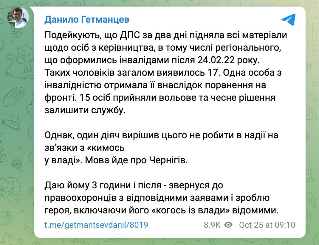 Всего в руководстве ГНС обнаружили 17 человек с инвалидностью. Но один получил ее после ранения на фронте, а ещё один налоговик, по словам Гетманцева, не стал увольняться, а пытается решить проблему "с кем-то во власти". Гетманцев пообещал назвать его имя и обратиться к правоохранителям, если он не уволится добровольно.