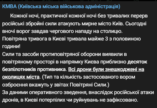 08:20 Ночью россияне атаковали Киев ударными дронами. Воздушная тревога длилась почти 3 с половиной часа. Об этом сообщает КГВА.