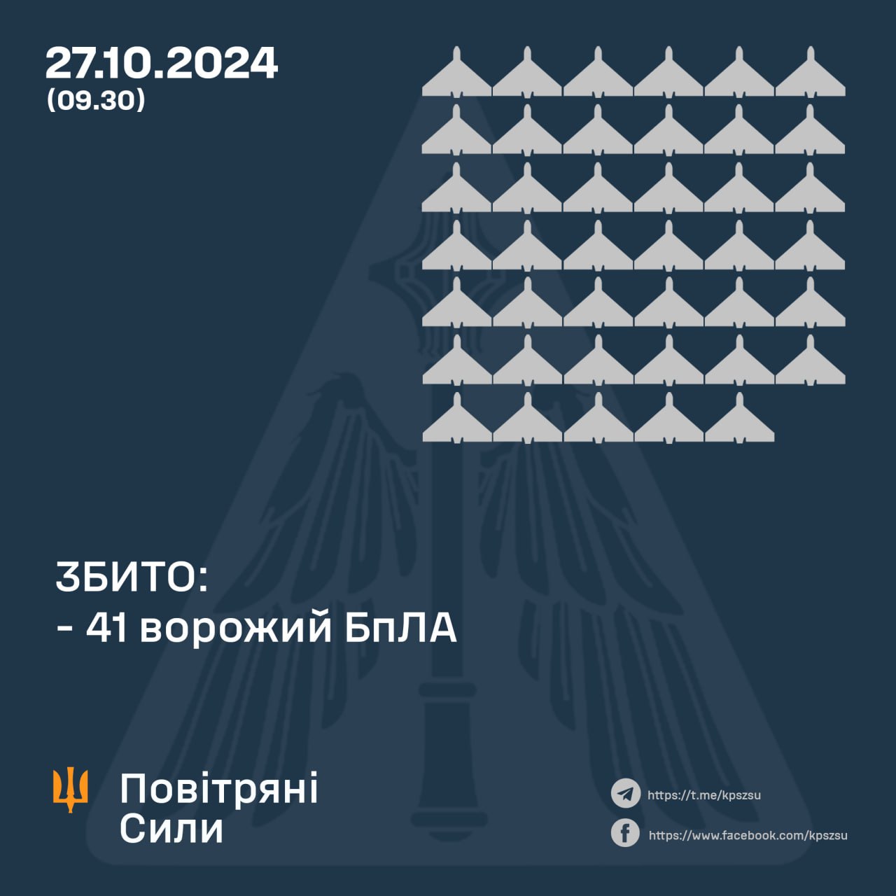 Подтверждено сбитие 41 вражеского БпЛА в Одесской, Николаевской, Херсонской, Киевской, Сумской, Кировоградской, Черкасской, Житомирской, Хмельницкой и Черниговской областях. Большинство вражеских БПЛА сбито в Одесской и Киевской областях.