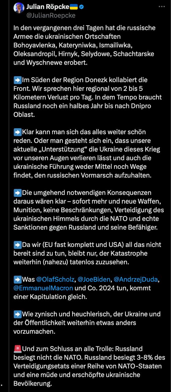 "Можно признать, что наша нынешняя "поддержка" приводит к тому, что Украина проигрывает эту войну на наших глазах и что украинское руководство не может найти никаких средств или способов остановить наступление России", - пишет Рёпке.