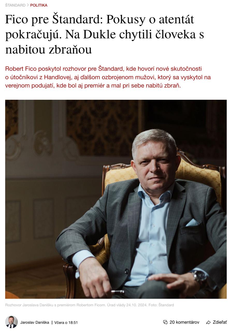 Премьер Словакии, который в мае уже пережил покушение, рассказал, что в прошлом месяце на перевале Дукла, где проходили мероприятия по случаю 80-летия Карпатско-Дуклинской военной операции, в зоне для посетителей у мужчины на металлоискателе нашли заряженный пистолет.