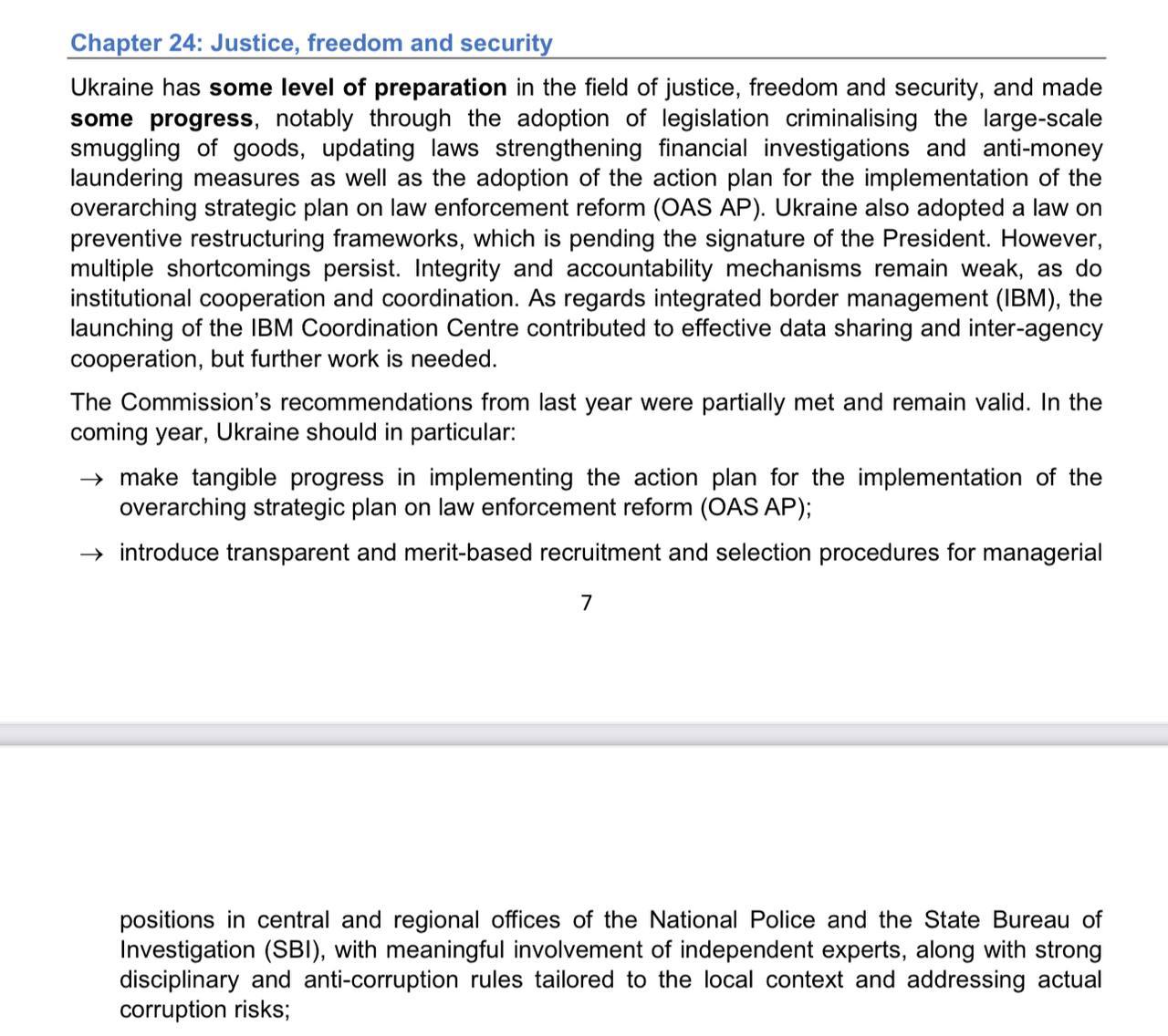 "Внедрить прозрачные и основанные на заслугах процедуры отбора и назначения на руководящие должности в центральных и региональных офисах Национальной полиции и Государственного бюро расследований (ГБР) с привлечением независимых экспертов. Эти процедуры должны сопровождаться строгими дисциплинарными и антикоррупционными правилами, адаптированными к местному контексту и направленными на устранение реальных коррупционных рисков", - говорится в документе.