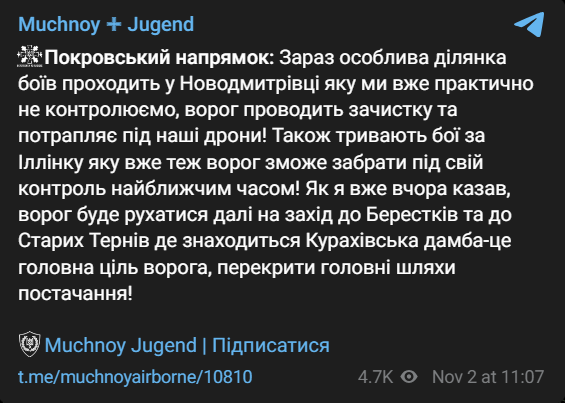 "Сейчас особый участок боёв проходит в Новодмитровке, которую мы уже практически не контролируем, враг проводит зачистку и попадает под наши дроны", - написал военный.