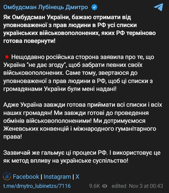 "Недавно российская сторона заявила о том, что Украина "не дает согласия", чтобы забрать своих военнопленных. Именно поэтому обращаюсь к уполномоченному по правам человека в РФ, чтобы эти списки с гражданами Украины были мне предоставлены!