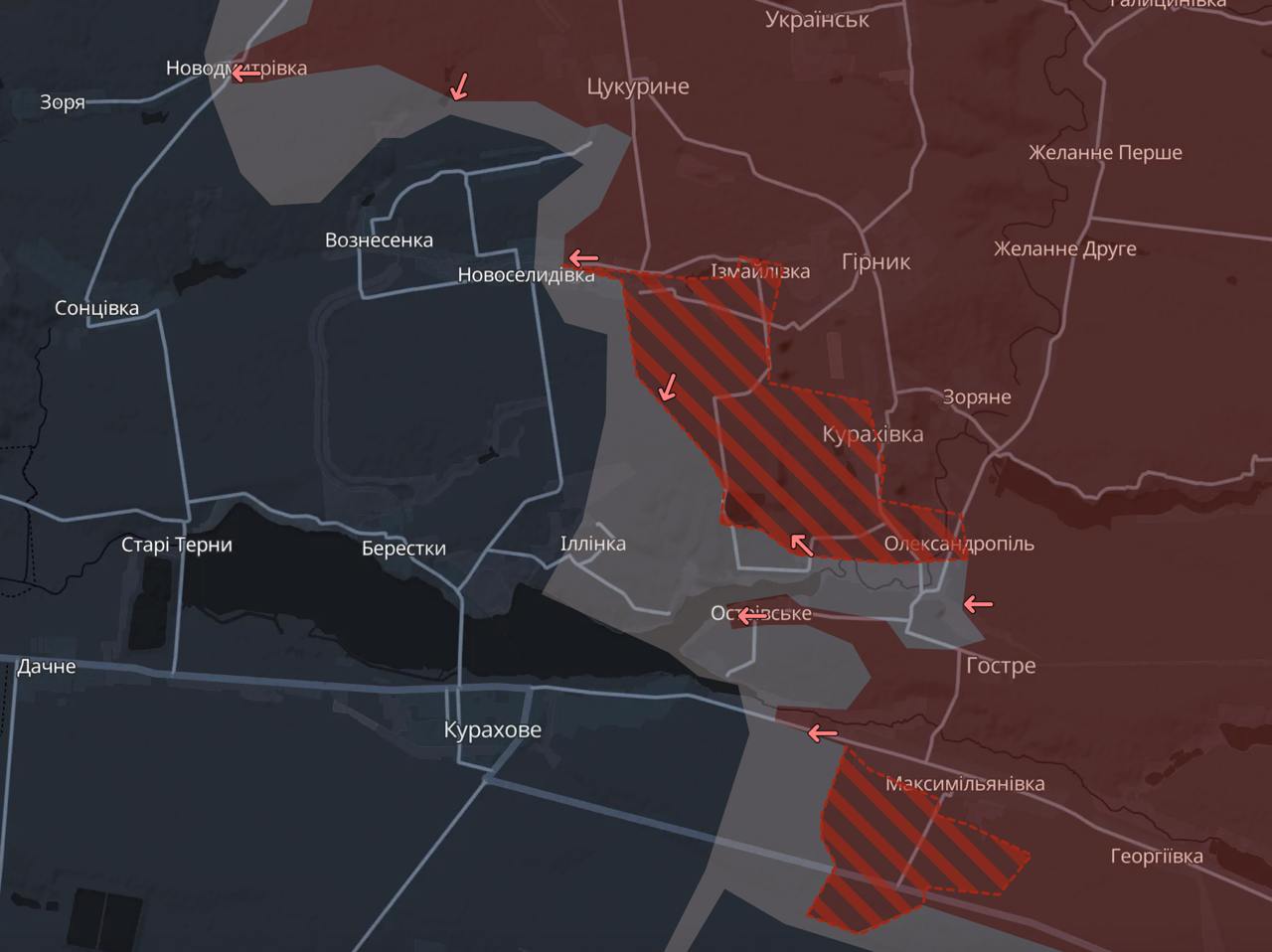 На условном северном фланге россияне продвинулись в районе Новоселидовки, Волченки и Новодмитровки, пишет украинский военный паблик Deep State. Украинские военные пишут о боях в селе Ильинка, которое примыкает с севера к Кураховскому водохранилищу.
