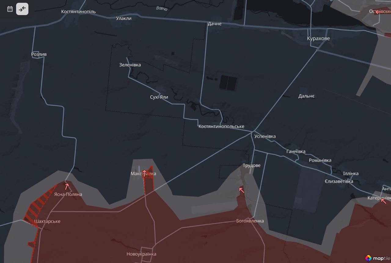 Особую опасность здесь представляет Новодмитровка, из которой дорога ведет на трассу к западу от Курахово. Российские паблики заявляют, что их войска находятся уже в двух километрах от следующего села - Солнцевки, от которой до западной трассы на Курахово менее шести километров (Украина приближения РФ к Солнцевке не подтверждала).