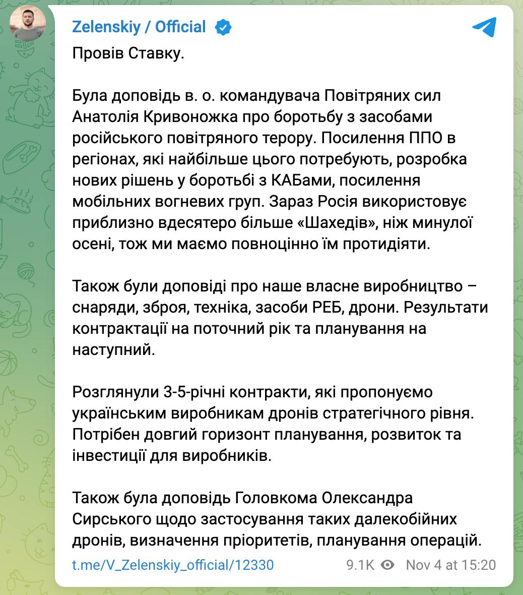 Об этом сообщил в своем телеграм-канале Владимир Зеленский по итогам заседания ставки верховного главнокомандующего.