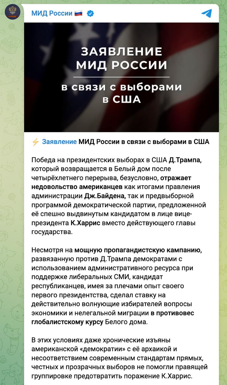 Также МИД РФ утверждает, что возвращение Трампа может "подстегнуть усиление внутренней напряжённости и ожесточение противоборствующих лагерей" в Штатах.