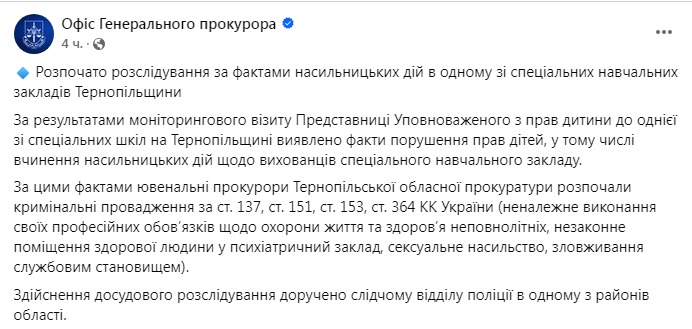 "По результатам мониторингового визита представителя уполномоченного по правам ребенка в одну из специальных школ в Тернопольской области выявлены факты нарушения прав детей, в том числе совершение насильственных действий в отношении воспитанников специального учебного заведения. По этим фактам ювенальные прокуроры Тернопольской областной прокуратуры начали уголовные производства по ст. 137, ст. 151, ст. 153, ст. 364 УК Украины (ненадлежащее исполнение своих профессиональных обязанностей по охране жизни и здоровья несовершеннолетних, незаконное помещение здорового человека в психиатрическое учреждение, сексуальное насилие, злоупотребление служебным положением). Досудебное расследование поручено следственному отделу полиции в одном из районов области", - сказано в публикации.