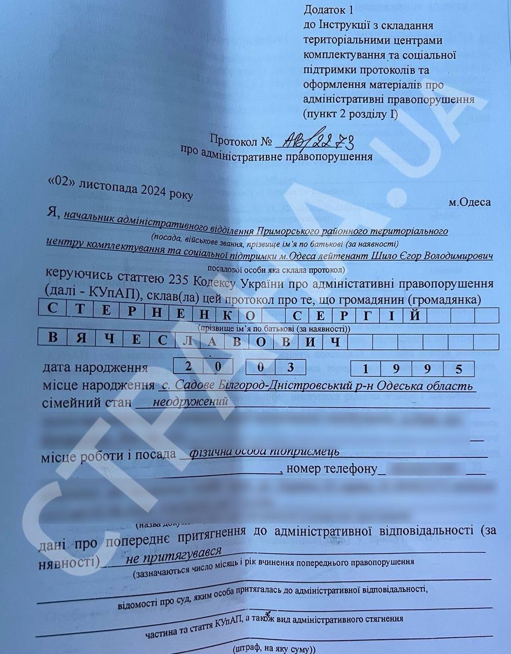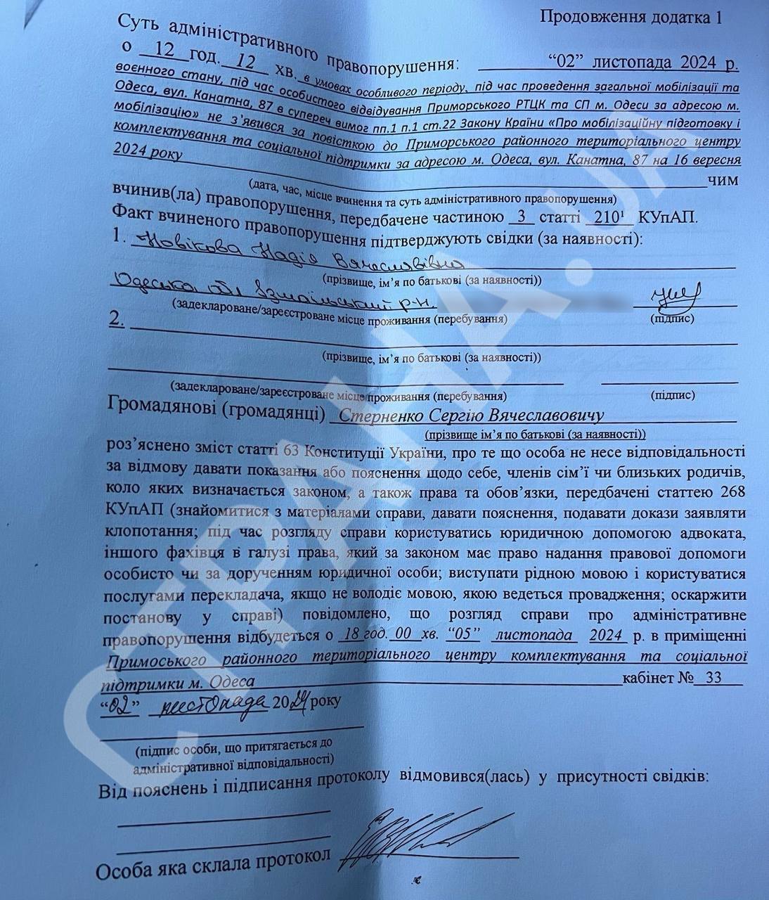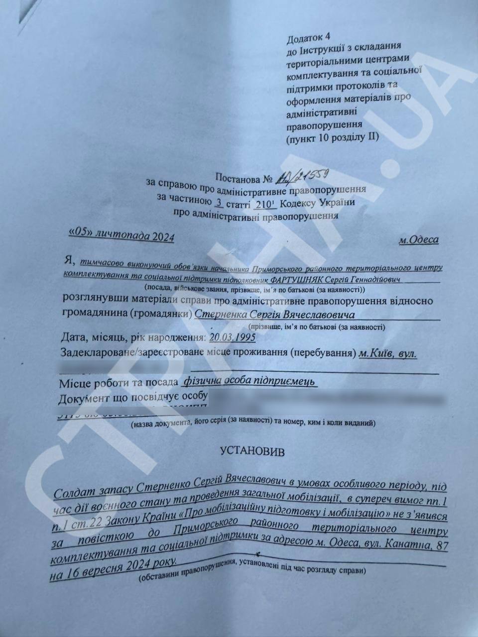 Документ подтверждает, что Стерненко не прибыл по повестке и определен ТЦК в качестве нарушителя воинского учета (в просторечье — уклонистом).