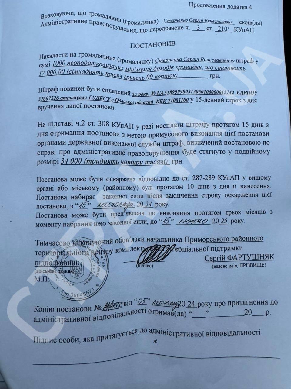 В распоряжении "Страны" оказалось постановление Приморского районного ТЦК Одессы о наложении штрафа на активиста-праворадикала Сергея Стерненко.