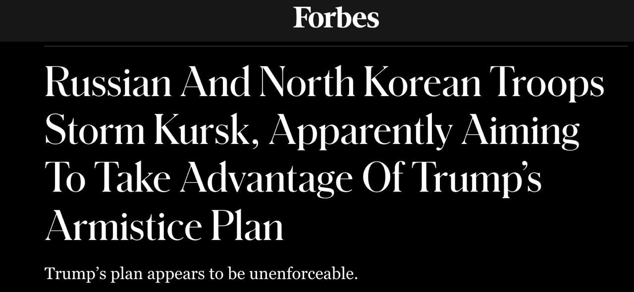Также Forbes писал, что предположительно, северокорейские военные вступили в бой в Курской области.