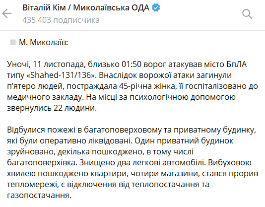 Полиция Николаевской области уточнила, что в одном из домов погибли четыре человека - трое женщин и мужчина. Ещё один человек погиб в многоэтажке.