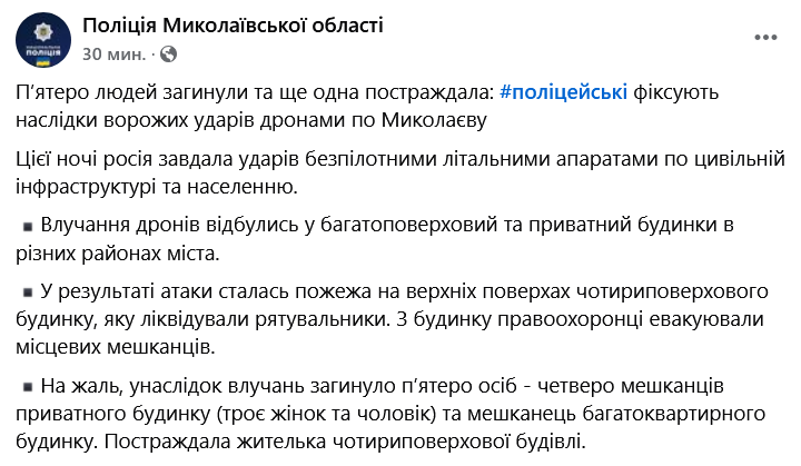 Ночью в Николаеве после попадания беспилотников "Шахед" по многоэтажке и частным домам погибли пять человек.