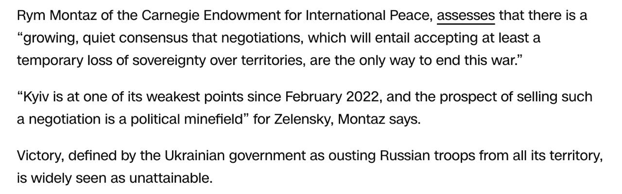 Монтаз считает, что существует "растущий, тихий консенсус в отношении того, что переговоры, которые повлекут за собой принятие хотя бы временной потери суверенитета над территориями, являются единственным способом положить конец этой войне".