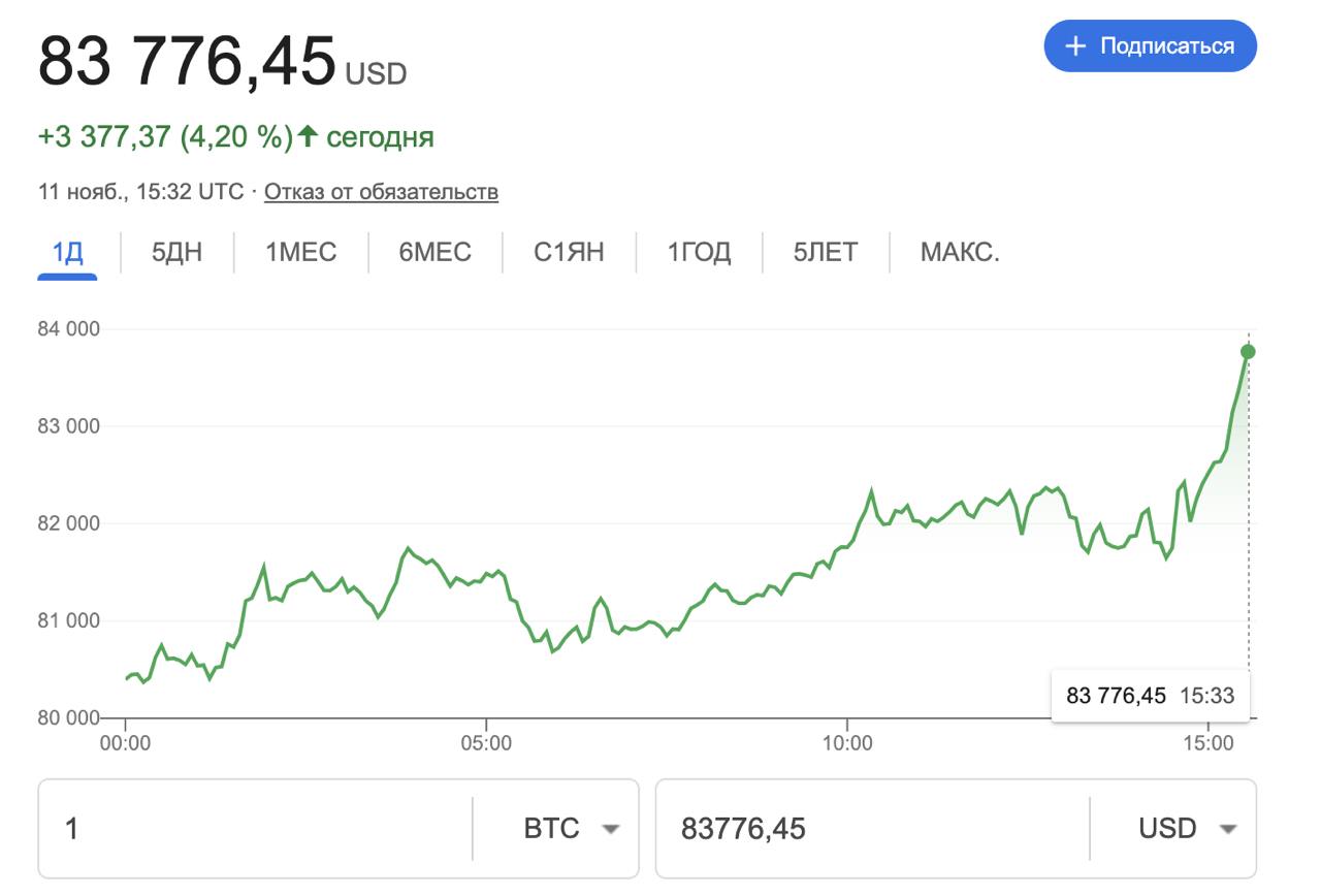Курс биткоина растет сейчас очень быстрыми темпами. Если в конце прошлой недели он достиг $80 тысяч, то новую начал с подорожания до $83 тысяч.