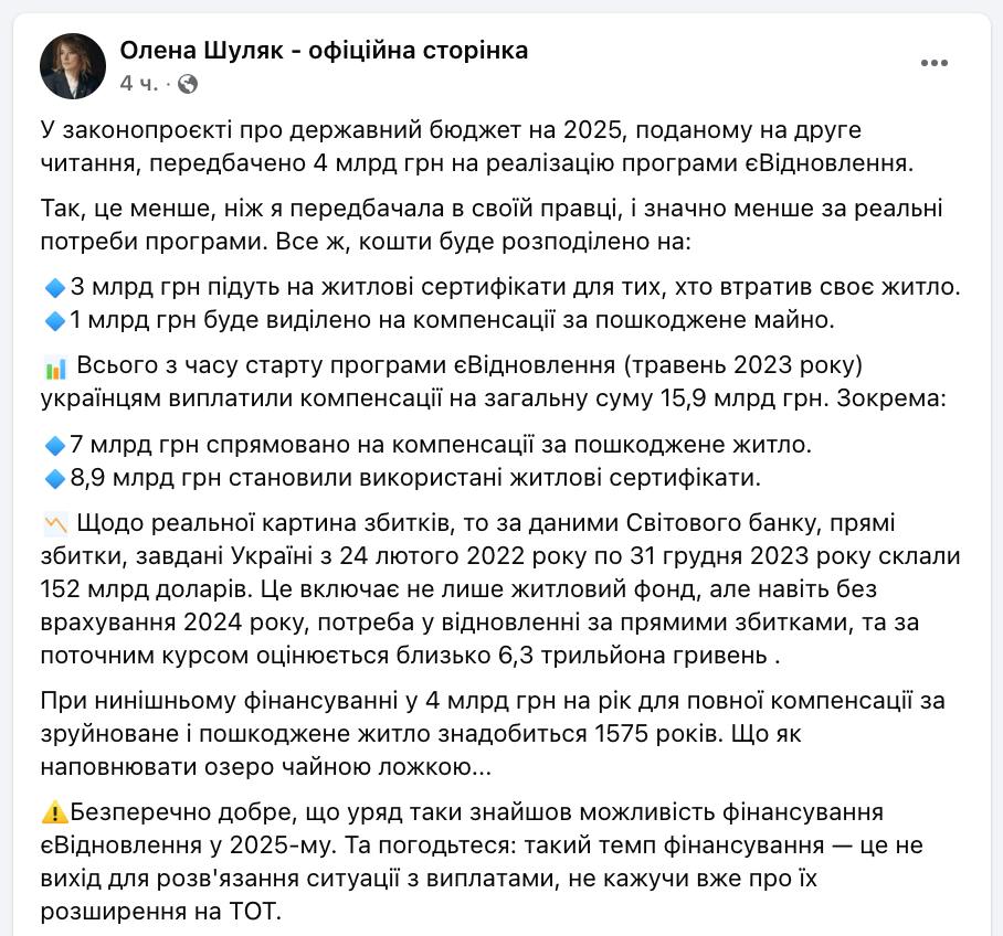 Так она прокомментировала то, что проект бюджета на 2025 год предусматривает выделение 4 млрд гривен ($96,7 млн) на выплату компенсаций за разрушенное жилье.
