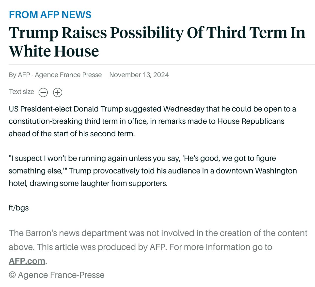 Избранный президент США Дональд Трамп допустил, что пойдет на третий срок.