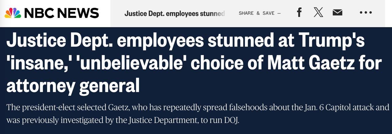 Сотрудники Министерства юстиции США ошеломлены "безумным" и "невероятным" решением Дональда Трампа назначить на пост генерального прокурора Мэтта Гетца.