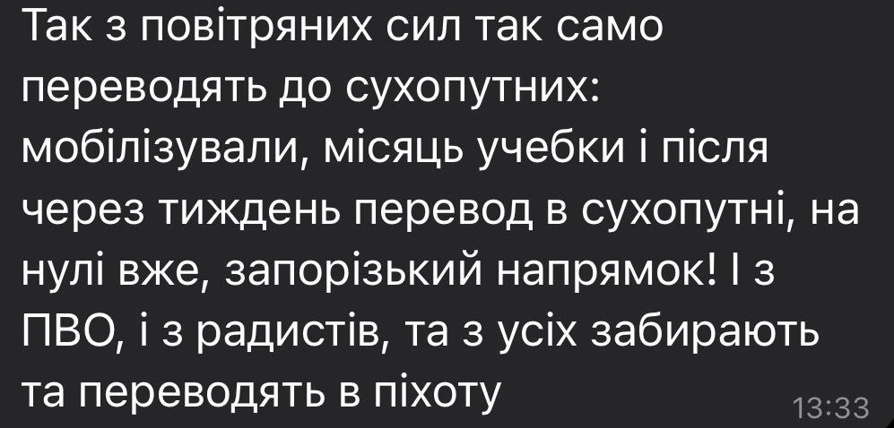 "Из воздушных сил также переводят в сухопутные: мобилизовали, месяц учебки и после через неделю перевод в сухопутные, на нули уже, запорожское направление. И с ПВО, и радистов, да всех забирают