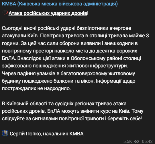 "За это время силы обороны обнаружили и обезвредили в воздушном пространстве вокруг города до десятка вражеских БПЛА. В результате этой атаки в Оболонском районе столицы зафиксировано повреждение жилищной инфраструктуры", - сообщил начальник КГВА Сергей Попко.