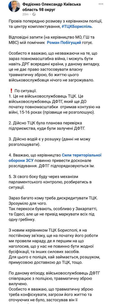Если очень кратко, во время совместных мероприятий по проверке одного из предприятий Бориспольского района были привлечены представители местного ДФТГ (добровольческого формирования территориальной общины - Ред.). Так поступают всегда во всех регионах Украины", - заявил Федиенко.