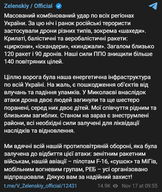 Президент отметил, что целью РФ была наша энергетическая инфраструктура по всей Украине.
