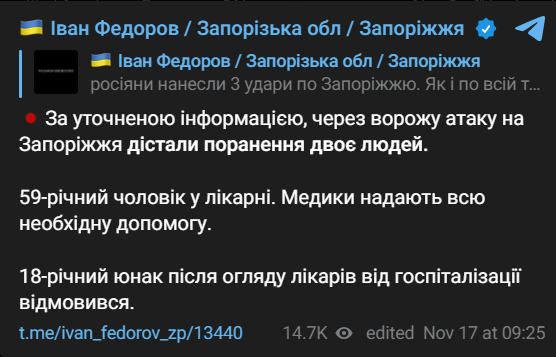 В Запорожье также были удары по инфраструктуре, сообщил глава ОВА Иван Фёдоров. Ранены два человека, 59-летний мужчина и 18-летний парень.