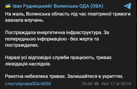 В Волынской области во время атаки повреждена энергетическая инфраструктура, сообщил глава ОВА Иван Рудницкий.