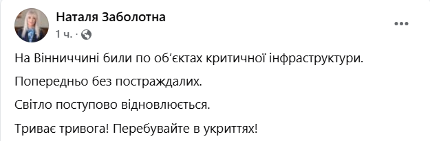 В Виннице также били по объектам критической инфраструктуры, сообщила замглавы ОВА Наталья Заболотная.