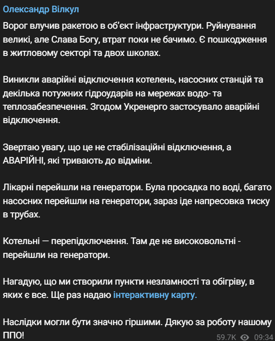 В городе нет света, больницы перешли на генераторы. Также исчезала вода, насосные станции сейчас переводят на альтернативные источники питания.