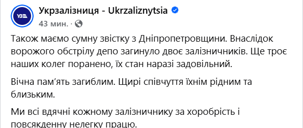 "В результате вражеского обстрела депо погибли двое железнодорожников. Еще трое наших коллег ранены, их состояние пока удовлетворительное", - говорится в сообщении.
