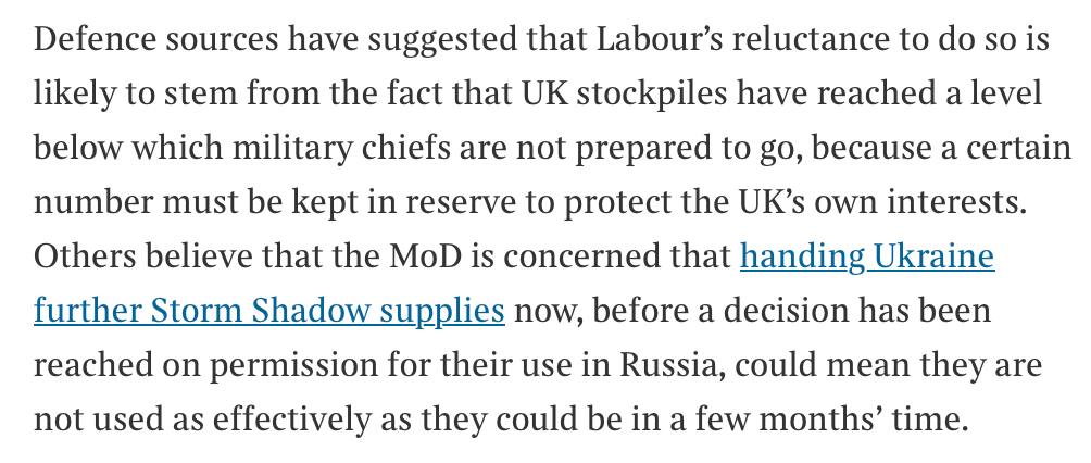 При этом другие источники считают, что передача Украине дополнительных Storm Shadow сейчас, до принятия решения о разрешении на их использование по территории России, "может означать, что они не будут использоваться так эффективно, как могли бы быть через несколько месяцев".