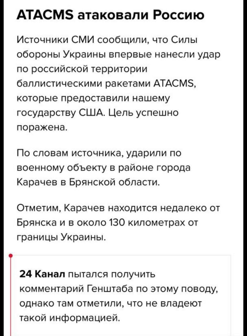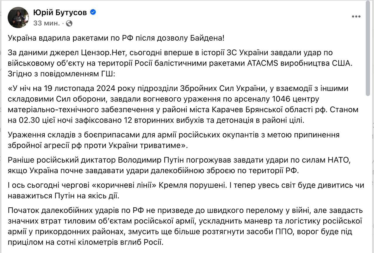 Вскоре после появления публикации Бутусова в комментарии "Каналу 24" Генштаб заявил, что не владеет информацией об ударах американскими дальнобойными ракетами ATACMS по территории России.