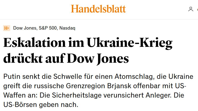 Эскалация войны в Украине после разрешения США на дальнобойные удары по РФ понизила индекс американского фондового рынка Dow Jones сразу на 350 пунктов.
