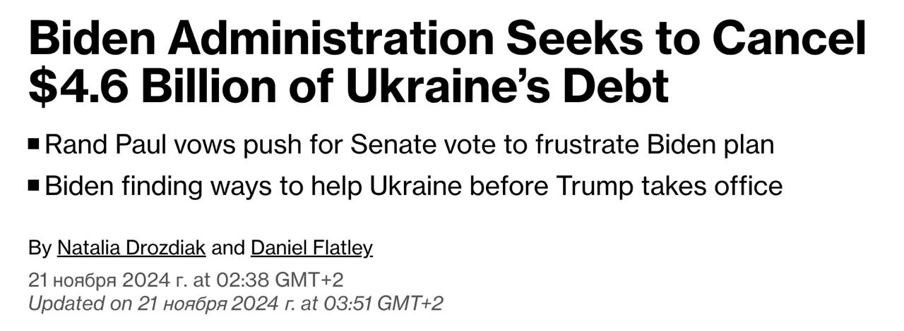 В то же время, народный депутат Ярослав Железняк сообщает, что в Сенате сегодня ночью уже состоялось голосование по инициативе Байдена списать с Украины 4,65 млрд долларов долга за военную помощь.
