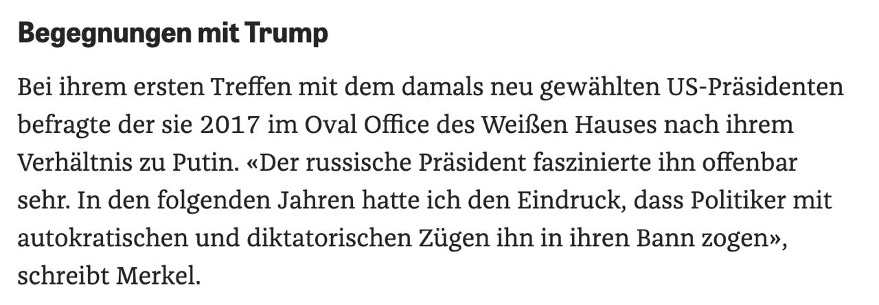 Также Меркель заявляет в своих мемуарах, что Трамп был "очарован" Путиным в свой первый президентский срок.