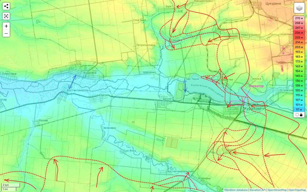 Также, по версии россиян, с востока бои подходят к имеющей ключевое значение деревне Старые Терны к северо-западу от Курахово и водохранилища.