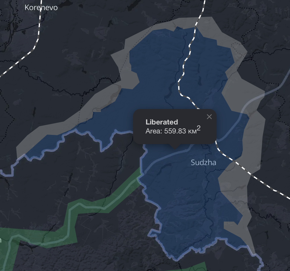 При этом ресурс Deep State указывает сейчас контроль только над 559,83 квадратных километров. А российские ресурсы указывают ещё меньшую площадь - 450-500 квадратных километров.