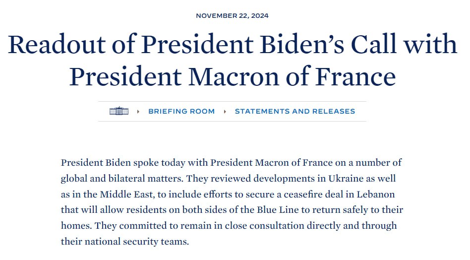 После испытания новой российской ракеты средней дальности "Орешник" президент США Джо Байден созвонился с президентом Франции Эмманюэлем Макроном, чтобы обсудить развитие событий в Украине.