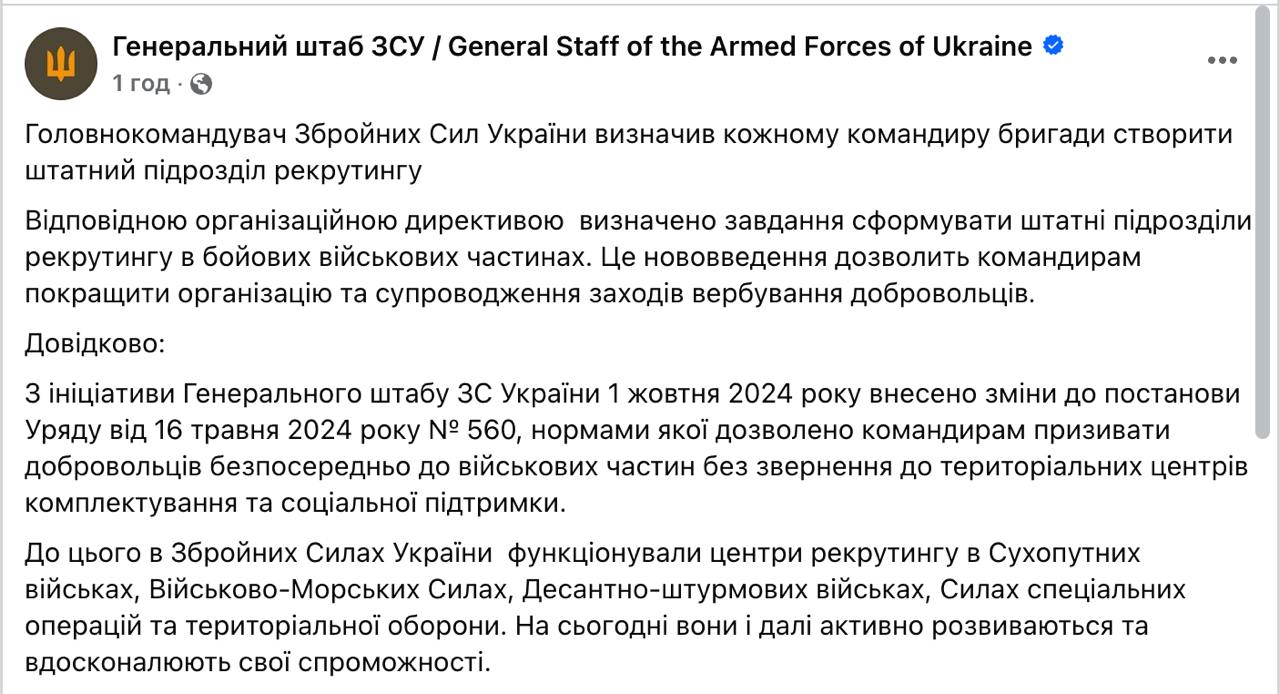 10.57 Главком Сырский поручил командирам бригад создать в каждой части штатное подразделение рекрутинга, сообщает Генштаб.