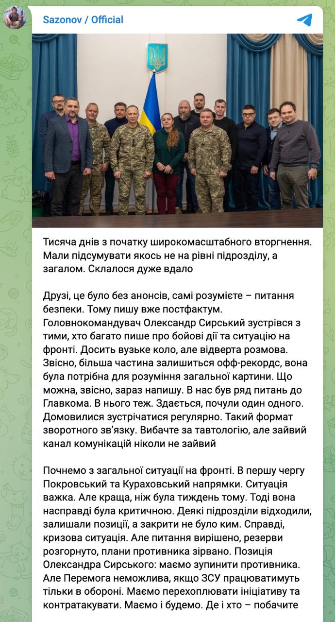 Такое заявление сделал главнокомандующий ВСУ Александр Сырский на недавней встрече с военными блогерами. Подробности заявления привел в своем телеграм-канале участник встречи военный Кирилл Сазонов.