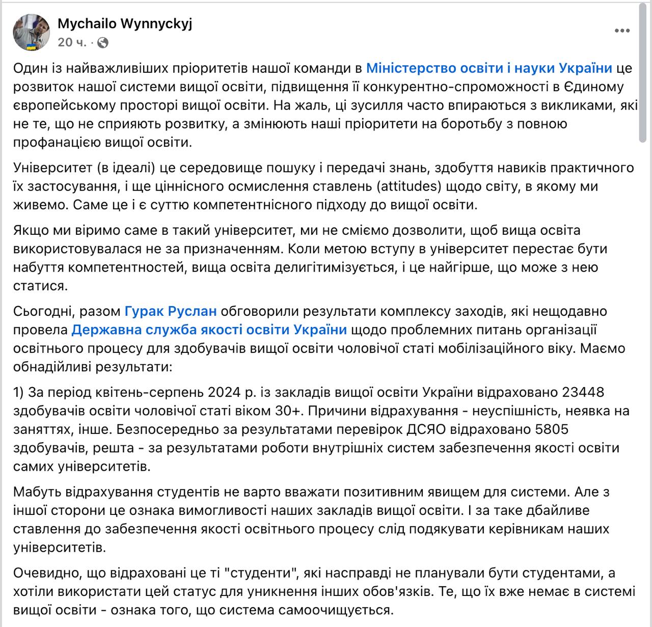 "Причины отчисления – неуспеваемость, неявка на занятия, прочее. Очевидно, что отчислены те "студенты", которые на самом деле не планировали быть студентами, а хотели использовать этот статус во избежание других обязанностей", - пишет Винницкий.