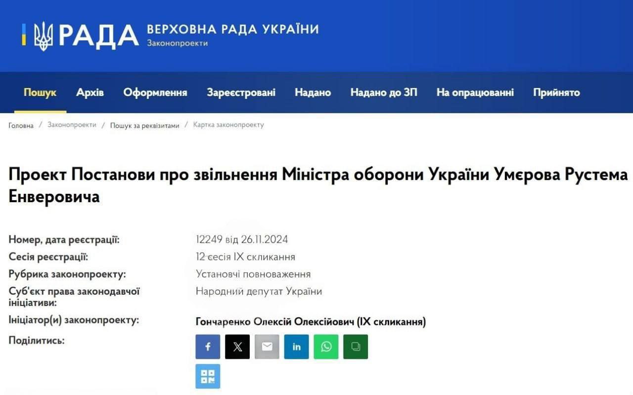 В Верховной Раде зарегистрировали проект постановления об освобождении министра обороны Украины Рустема Умерова от должности.